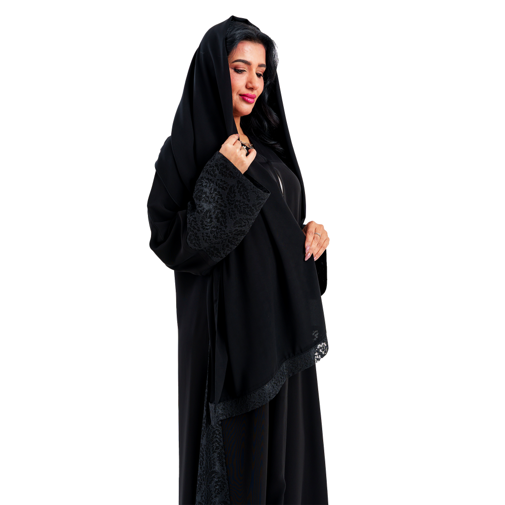 - طول العباية: يُقاس من الكتف حتى أسفل الكعبين من الأمام