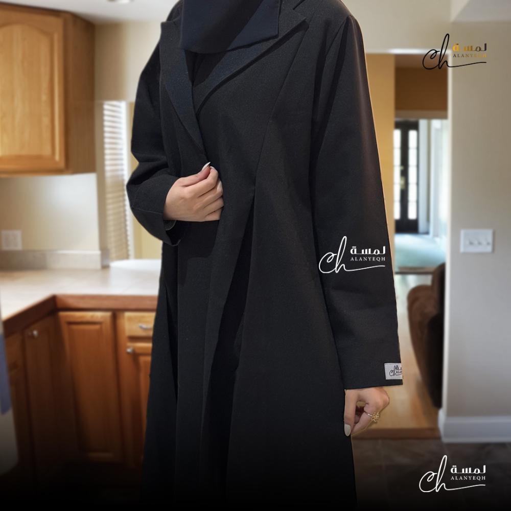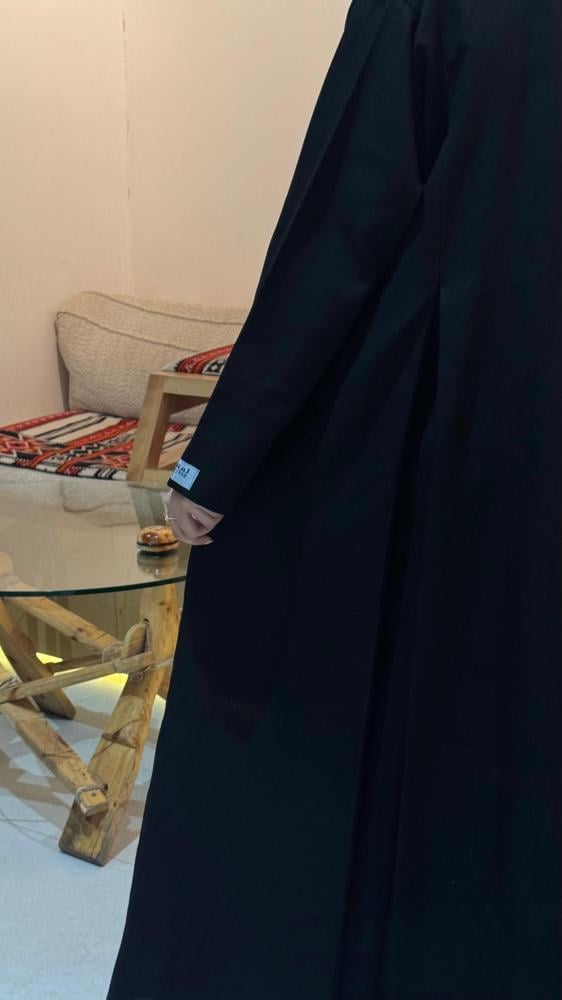 الوصف: عباية بتصميم فريد وعصري، مصنوعة من قماش كريب لمار المميز، بتفاصيل أنيقة تعكس لمسة راقية. تتميز العباية بموديل ربع كلوش، مع قص كوت بكسرات خفيفة أمامية وخلفية، مما يضيف لها طابعاً أنيقاً ومريحاً.
